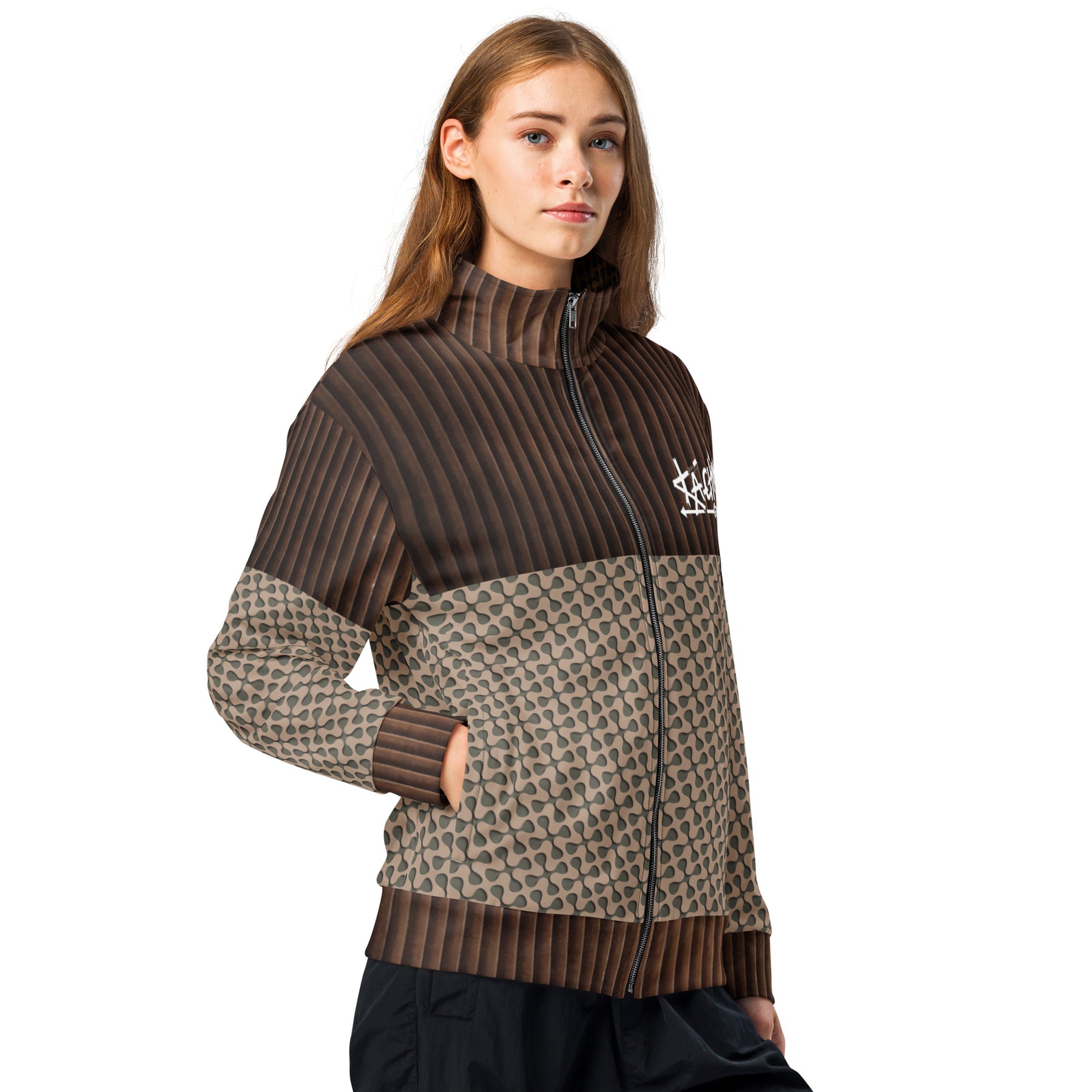 Stay warm and trendy with this zip-up track jacket—perfect for workouts, outdoor activities, and everyday wear. It’s made from recycled materials, has brushed fleece inside for warmth, and zippered pockets.